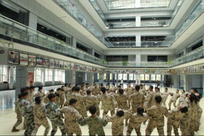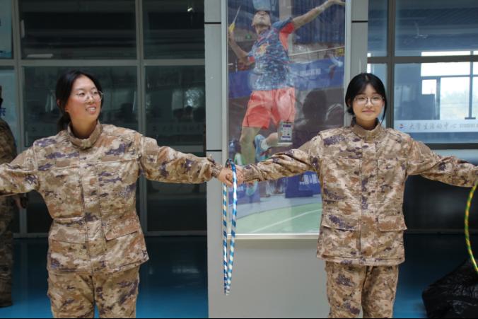 活动现场,学长教官们热情高涨,先后参与了老鹰捉小鸡、手牵手身体传呼啦圈、围圈后仰三个趣味项目。在老鹰捉小鸡游戏中,“老鹰”身手矫健,“鸡妈妈”全力守护,“小鸡们”紧密跟随,大家在奔跑与躲闪间,不仅重温了童年乐趣,更在角色配合中加深了彼此的信任。