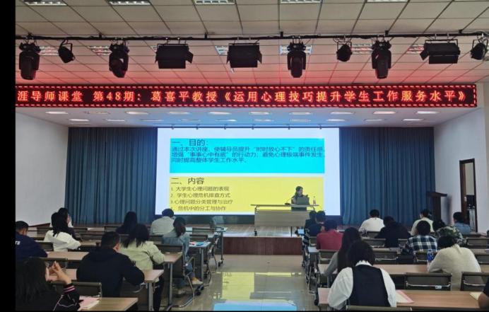 8日,葛喜平教授在二号教学区2508会议室为各学院副书记、学工处与学发中心全体教职工、辅导员及生涯导师作了题为《运用心理技巧提升学生工作服务水平》的专题交流。讲座从大学生心理问题的典型表现入手,系统分析了不同阶段学生心理变化的特点,重点讲解了心理危机排查的多元途径与预警机制,并阐述了心理问题的分类管理以及危机干预中的多部门协作流程。葛喜平还详细介绍了如何有效向学生推荐心理援助资源、如何在干预中保持专业边界,以及如何开展系统、温暖的人文关怀与心理疏导。