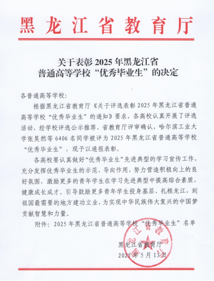 近日,黑龙江省教育厅公布获得黑龙江省普通高等学校省级优秀毕业生名单。我校机电学院李浩男、土木与管理学院刘洋、信息学院赵洪宇、医学院翁雨诺等47名学生获得2025年黑龙江省普通高等学校“优秀毕业生”荣誉称号。自评选工作开展以...